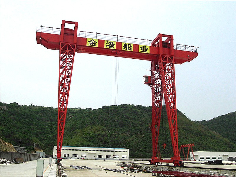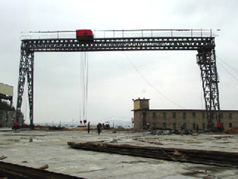 造船门式起重机适用于造船厂制作场所(船坞、船台)进行造船作业,具有单吊、双点抬吊、三点抬吊、空中翻转吊件和轻载(≤50%满载)快速升降、低风速(≤8m/s)快速运行等多种作业功能,在起重机整体吊装