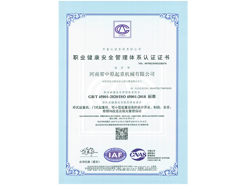 职业健康安全管理体系认证证书